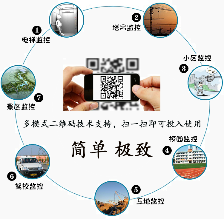 点对点/点对多点监控/同现场多组投放/宽带传输/电梯分组模式/等多元化二维码扫码技术支持,不需要技术员,更不需要工程师, 一部手机,一杯清茶的时间即可完成工程部署。